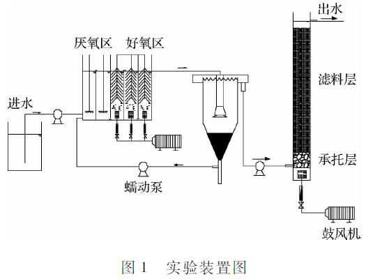 實(shí)驗(yàn)用裝置如圖1所示,主要由水解酸化-接觸氧化反應(yīng)器和BAF@反應(yīng)器組成。其中水解酸化-接觸氧化反應(yīng)器為主反應(yīng)單元,厭氧區(qū)有效容積12L,好氧區(qū)有效容積18L。BAF反應(yīng)器為深度處理單元,有機(jī)玻璃結(jié)構(gòu),內(nèi)徑50mm,高2m,濾料層高度為1.8m,有效空床體積為14L,濾料材質(zhì)為陶粒,粒徑范圍3~5mm。